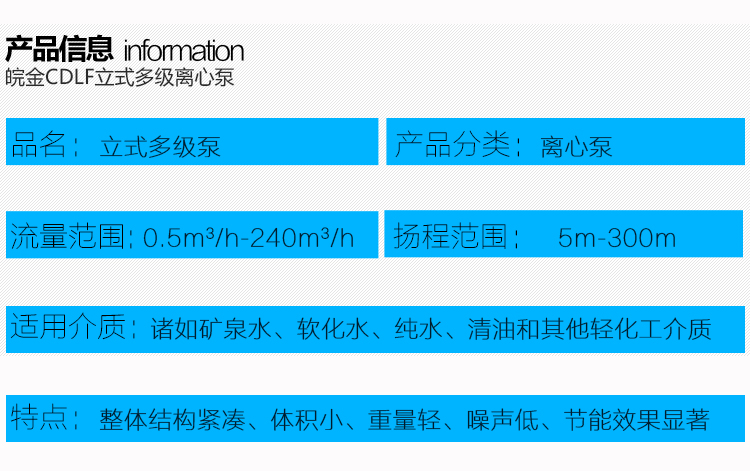 ·多級泵的進水口與出水口位于泵座同一水平線上,可直接用于管路當中。