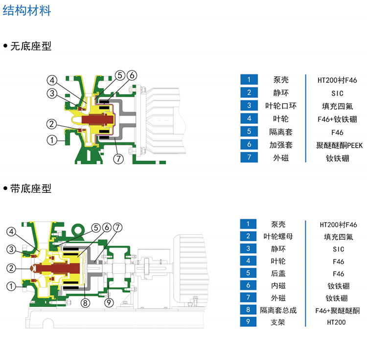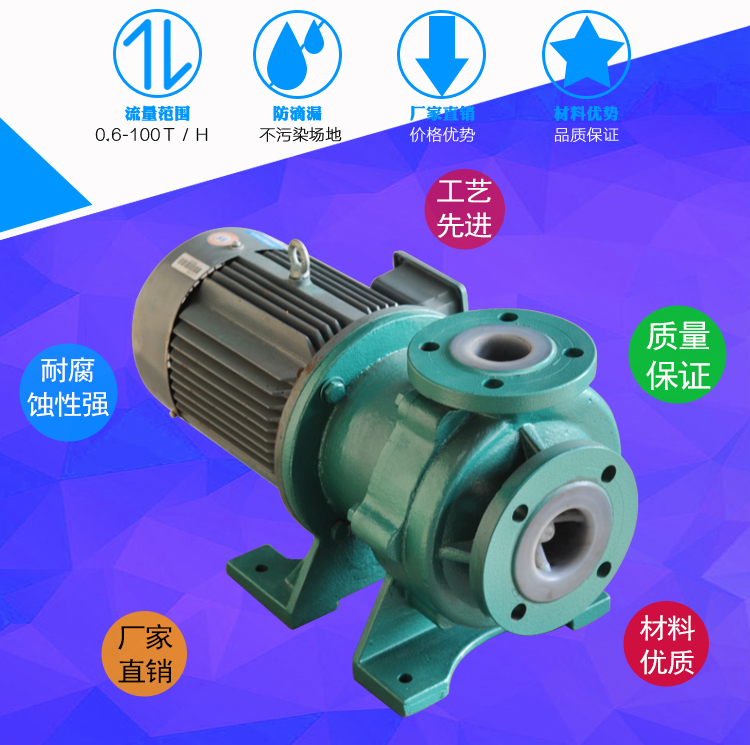 WJC-FJ堿液磁力泵俗稱襯氟磁力驅動泵,其中非金屬材質耐腐蝕磁力泵應用廣泛,非金屬材質中氟塑料磁力泵,襯氟磁力泵其過流部件采用氟塑料及高純度碳化硅制成