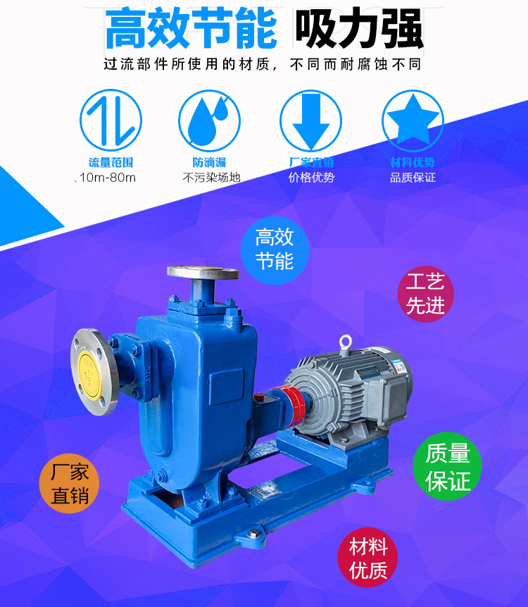 2、高效節能:采用優秀水力模型,效率比一般自吸泵高3~5%;
